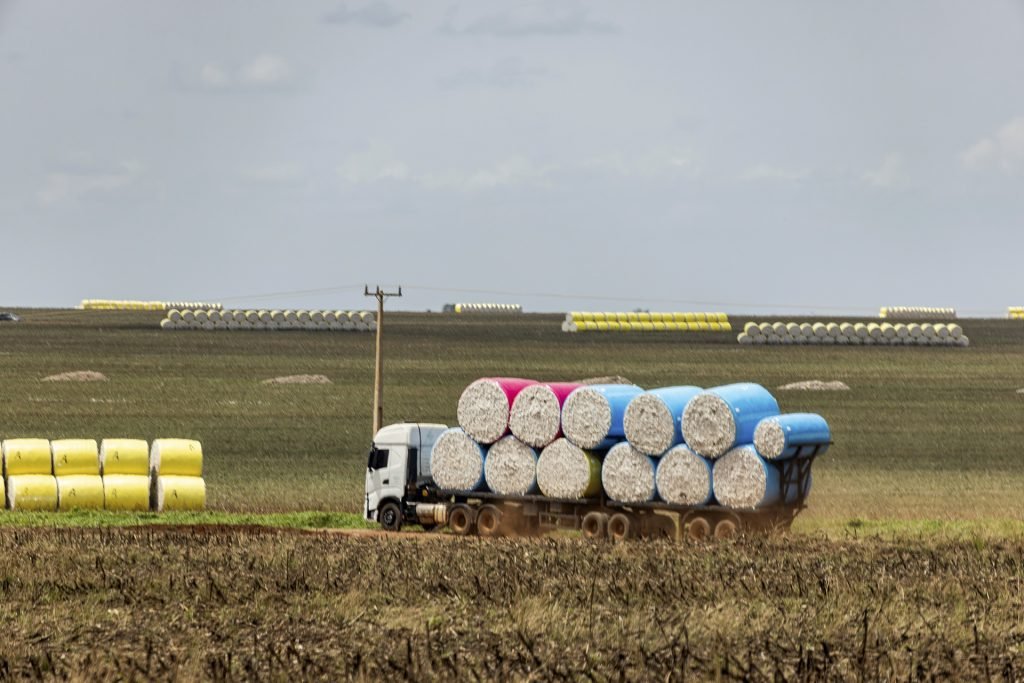 Quando SUMAÚMA esteve na região, em setembro passado, a fibra já havia sido colhida por máquinas e acondicionada em plásticos de cores variadas. Formam-se então enormes fardos de algodão, pesando cerca de 2,5 toneladas cada um. Extensas fileiras, a perder de vista, compostas por essas bolas azuis, cor-de-rosa ou verdes, se espalham pelas fazendas à espera dos caminhões que vão levá-las às fábricas têxteis.